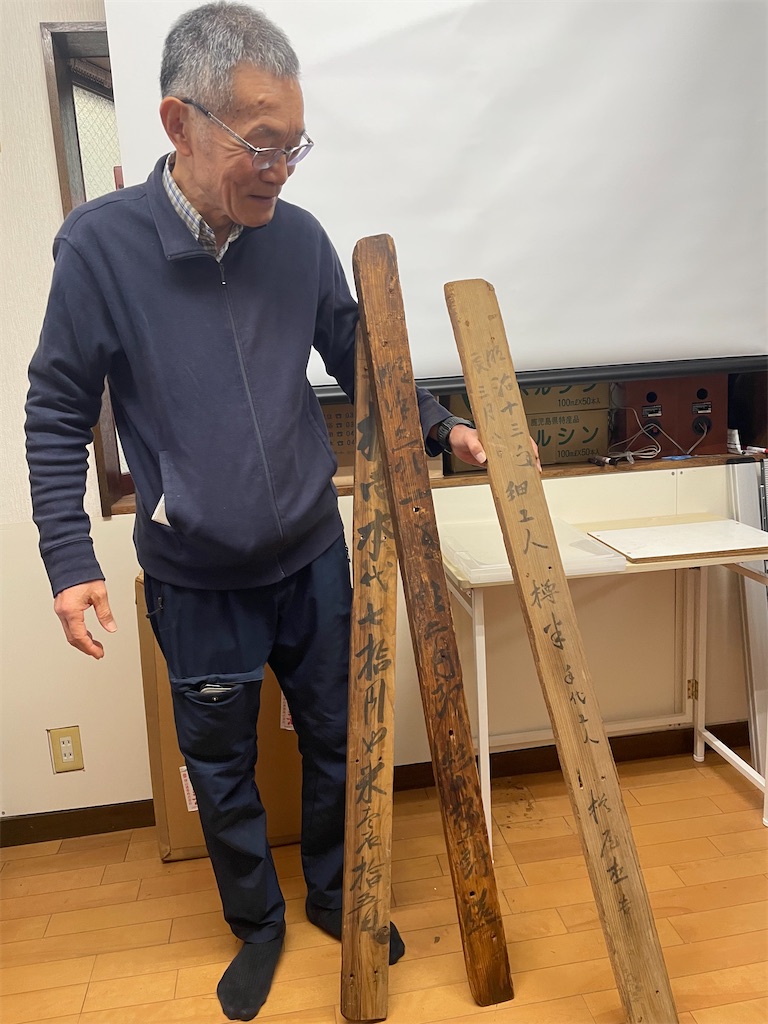 ☝こちら東先生と、先生の研究所に保管してある木桶の底板。